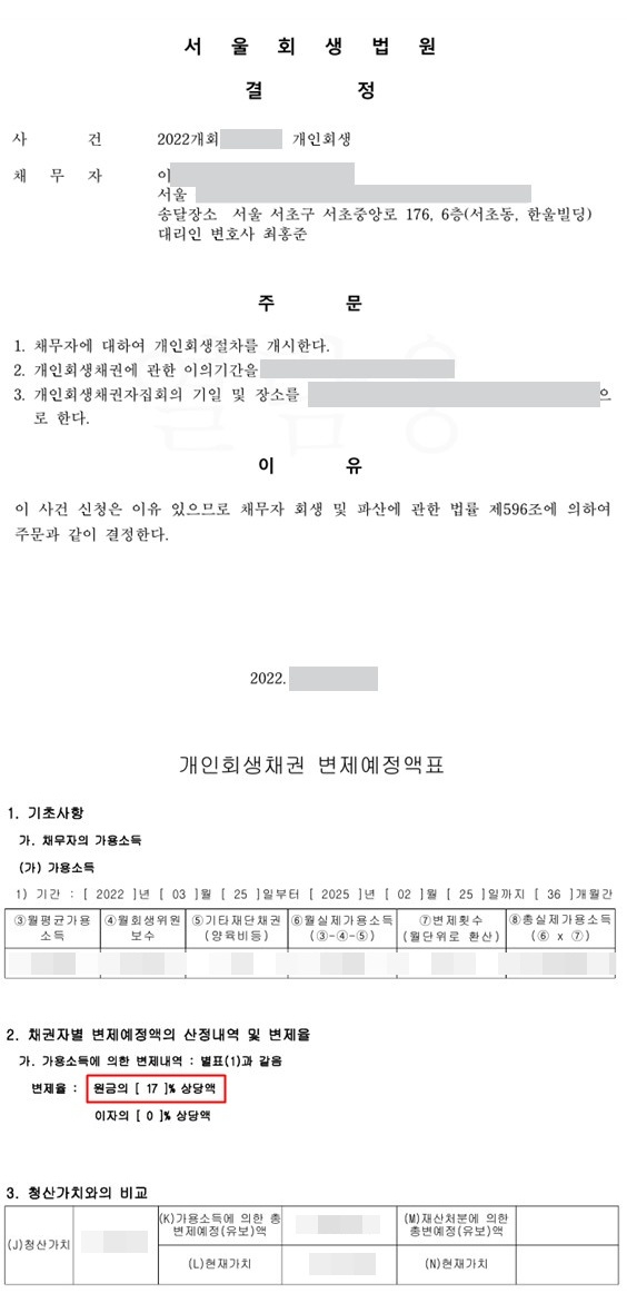 단기간에, 매우 낮은 변제율로 법원의 결정을 받은 성공적인 사례입니다.