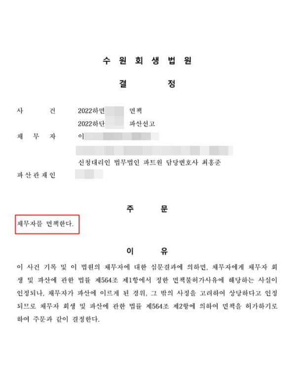 해당 사건은 개인파산 및 면책 사건으로 수원회생법원에서 접수되었던 사건입니다.