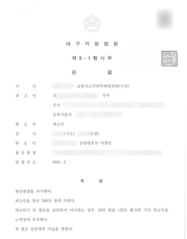 신속하게 법무법인 파트원에 조력을 요청한 결과, 원심판결을 파기하고 변론을 거쳐 벌금형을 선고받을 수 있었습니다.