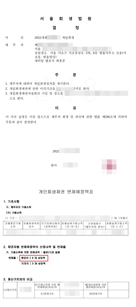 그 결과 아르바이트 소득임에도 불구하고, 월 변제금 약16만 원을 납부하며 원금 9% 변제라는 좋은 결과로 개시결정을 받을 수 있었던 사례입니다.