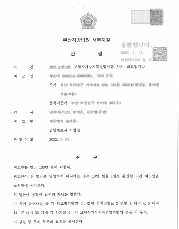 의뢰인은 치과에서 보험청구 업무를 담당하였으며, 보험회사로부터 보험금을 받기로 공모하며 일부 손님들의 실제 수술 횟수를 조작하였기에 보험사기방지특별법위반, 사기, 의료법위반으로 처벌을 앞둔 상태였습니다.