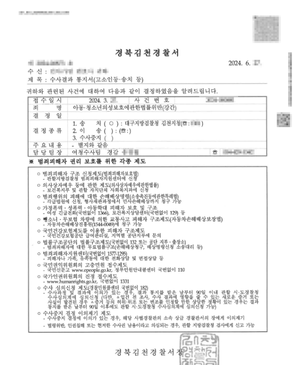 법무법인 파트원은 고소장 접수 이후 경찰에 적극적으로 요청하여 지역 센터에서 여성 경찰관으로부터 의뢰인 조사를 받을 수 있도록 조처하였고, 의뢰인도 편안한 상태에서 진술을 마칠 수 있었습니다. 그리고 경찰은 사건은 검찰에 송치하였습니다.