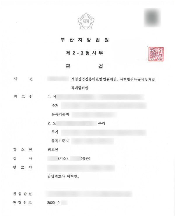 - 사건명 게임산업진흥에관한법률위반, 사행행위등규제및처벌 특례법위반